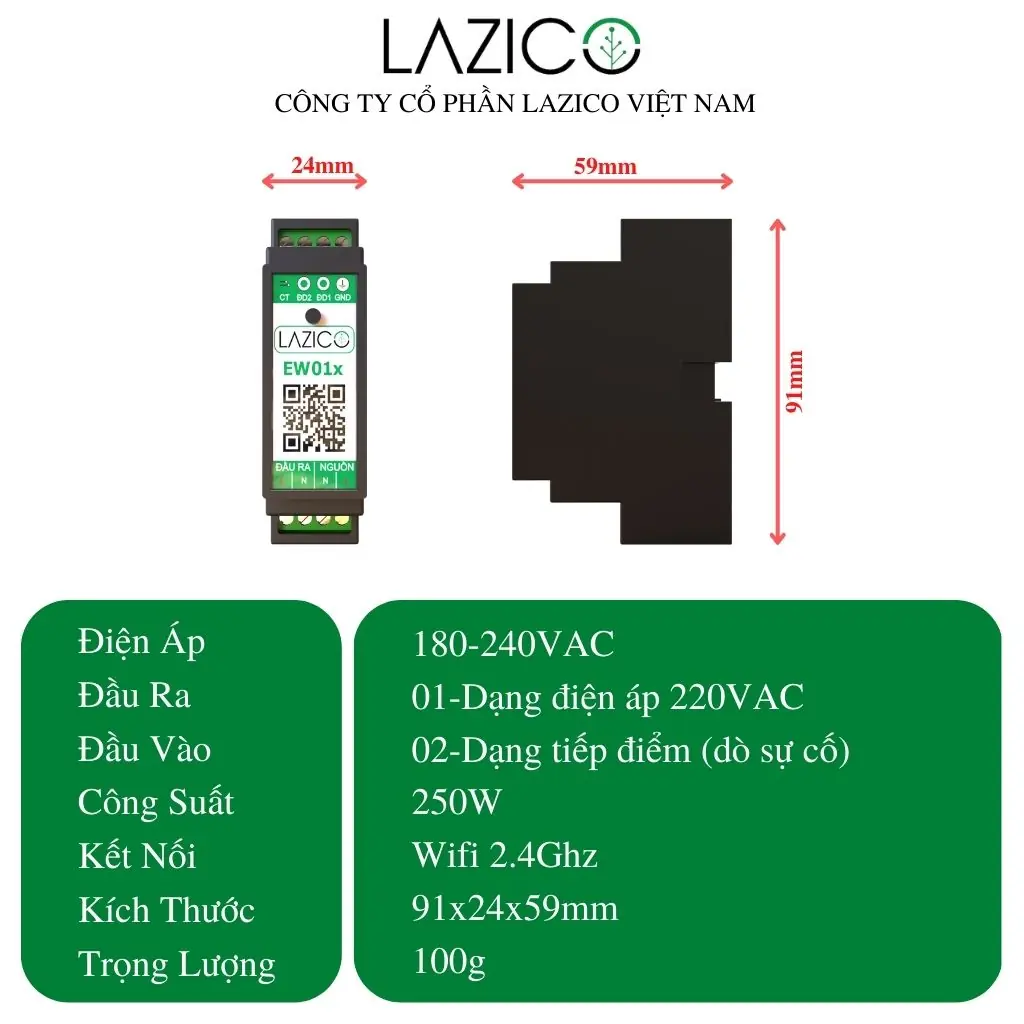 Thiết bị điều khiển WiFi EW01x 1 kênh giúp bật tắt từ xa qua điện thoại, có 2 đầu dò giám sát thông minh như báo cạn nước, quá áp, chống cháy... Kết nối app Lazico, điều khiển đa nền tảng, chia sẻ cho nhiều người cùng sử dụng