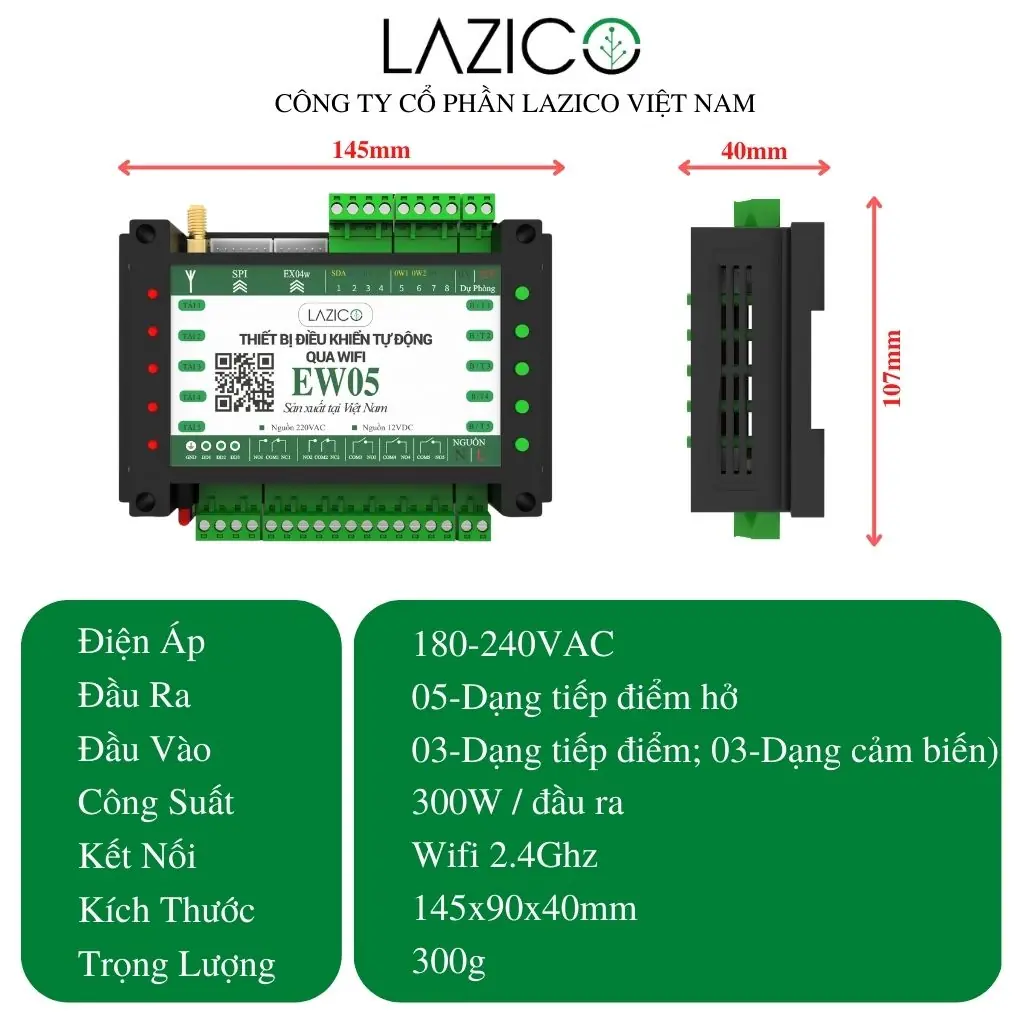 EW05 là bộ điều khiển thông minh cho phép điều khiển từ xa 5 thiết bị điện qua WiFi. Thiết bị tích hợp giám sát cảm biến nhiệt độ, độ ẩm không khí hoặc đất, xử lý sự cố theo cài đặt sẵn. Có thể mở rộng lên đến 37 đầu ra, dễ dàng cấu hình qua app Lazico (Android, iOS, Web). Ứng dụng lý tưởng cho nhà màng, vườn cây, trại chăn nuôi và hệ thống tự động hóa nhỏ.